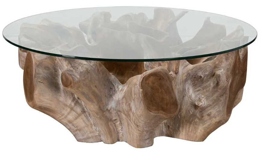 A stunning centerpiece for living rooms, this teak root and glass coffee table complements modern organic, boho, eco-luxe, and rustic interiors with dramatic natural elegance.