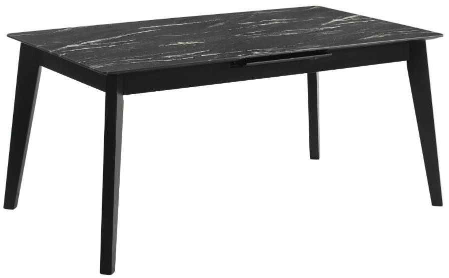 The luxurious look of faux marble creates a glam sensibility for a modern dining table. The black marble look of the tabletop complements a sleek base with fin-style legs and a recessed apron. The table includes a self-storing leaf for easy expansion to accommodate guests or the family.Read More