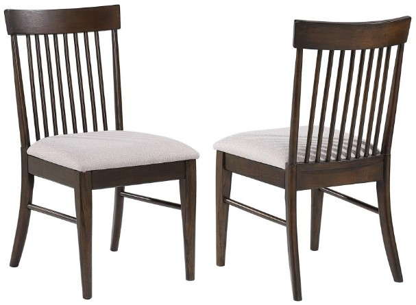 Neutral wheat upholstery sets a refined tone for a set of two mid-century dining side chairs. The armless chairs offer comfortable seating for your kitchen or dining room. Each features a foam padded seat that pairs perfectly with a classic spindle back. The spindle design lends airy elegance and timeless character to your table.Read More