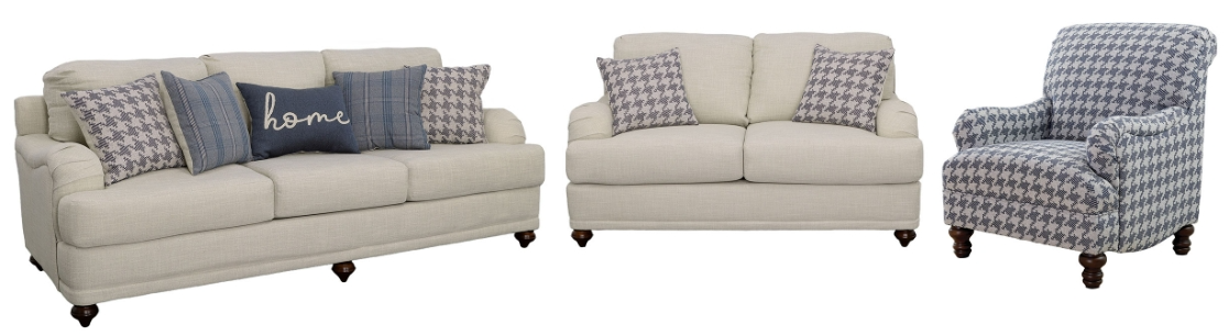 Farmhouse inspiration delivers a fresh, stylish look to a transitional space with this exceptional sofa. With tailored English arms and turned legs offering a contrasting espresso finish, this sofa shines with a pale grey linen-like upholstered cover. Enjoy the designer look of five accent pillows with varying blue print covers.Read More