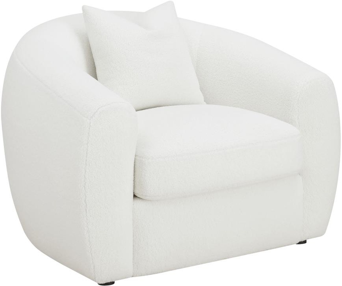 Elevate your modern living room with this cheerful, contemporary natural lounge chair, upholstered in a white teddy boucle fabric across its elegantly curved silhouette and sloped armrests. A single accent pillow in a matching boucle rests against the bench cushion.Read More