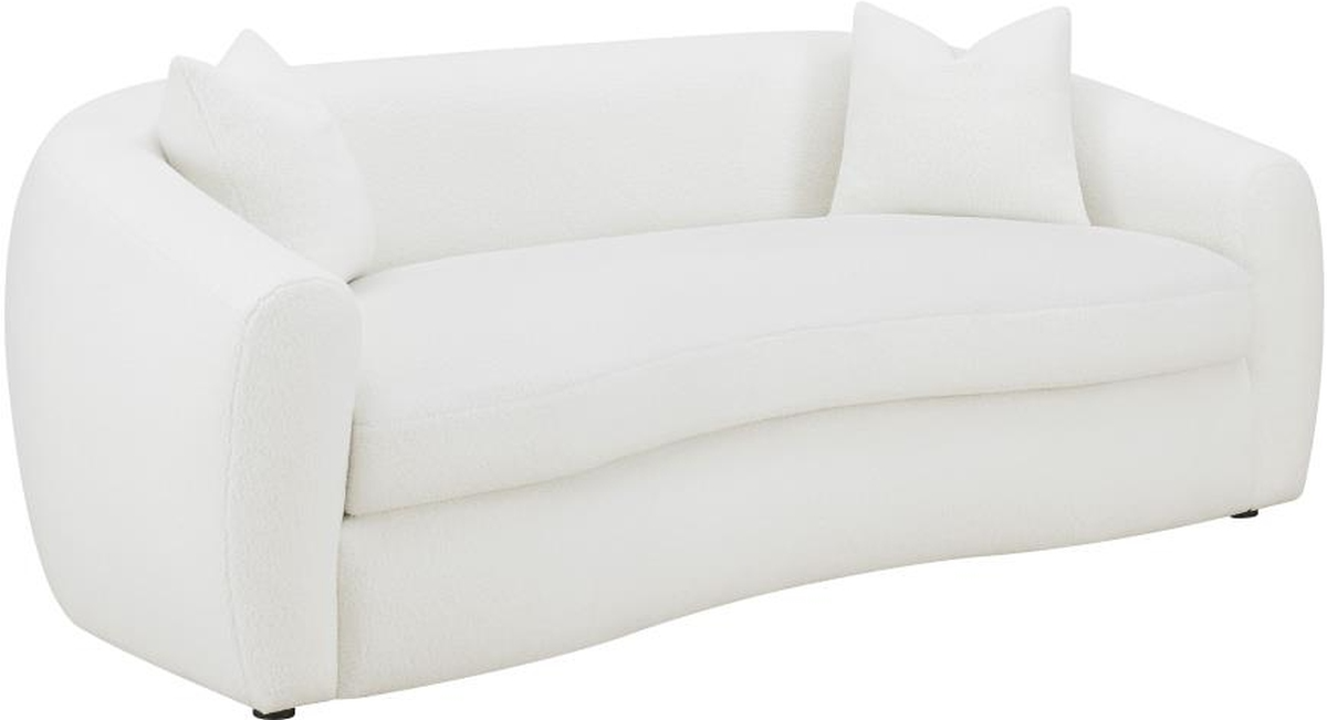 Create your inviting living room with this contemporary natural sofa, upholstered in boucle upholstery throughout its gracefully designed, contoured silhouette and elegantly sloped armrests. Matching accent pillows offer extra coziness and comfort to the curved bench cushion and tailored backrest.Read More