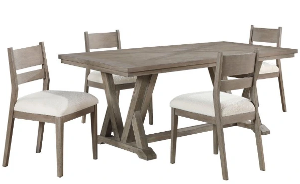 Trestle inspired style brings charming character to a five-piece modern farmhouse dining room set. It focuses on a rectangular dining table, complete with four side chairs that create a cohesive look with a casual coastal gray finish.Read More