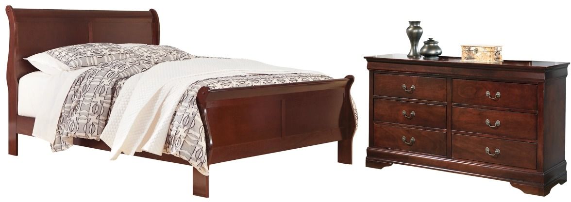 Includes queen sleigh bed (with headboard/footboard and rails) and dresser