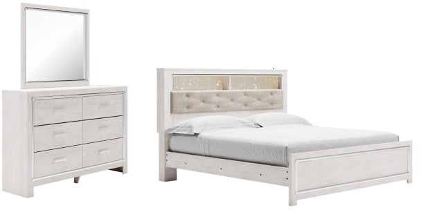 Includes upholstered panel bookcase bed (headboard, footboard and rails) and 6-drawer dresser with mirror