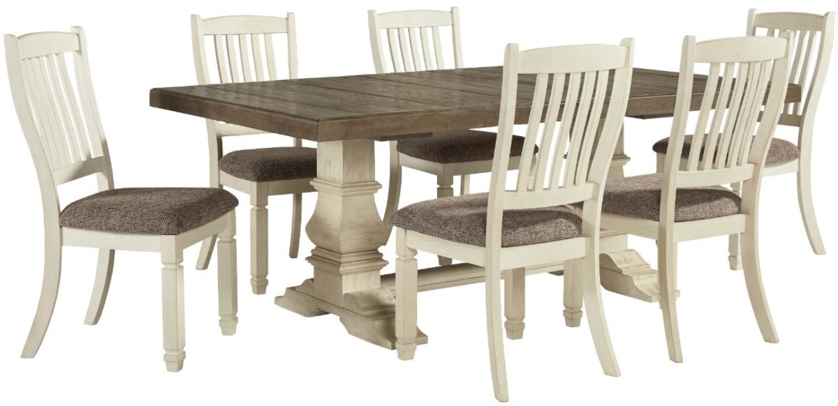Whether your style is farmhouse fresh, shabby chic or country cottage, you'll find the Bolanburg extension dining table works on so many levels. The table's two-tone finish, with weathered gray on the tabletop and textured antiqued white on the double-pedestal base, offers twice the character and twice the appeal.