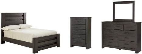 Includes full bed (headboard, footboard and rails), 7-drawer dresser with mirror and 5-drawer chest