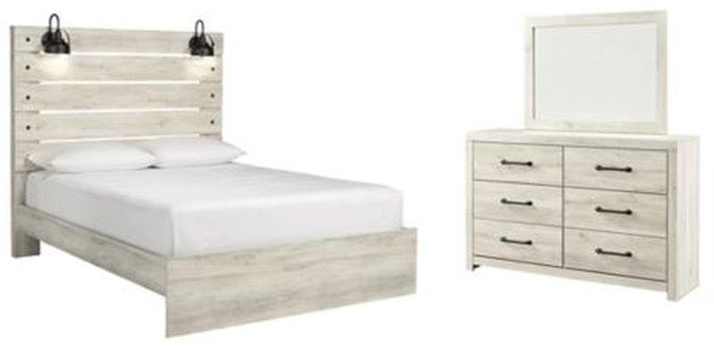 Includes panel bed (headboard, footboard and rails) and dresser with mirror