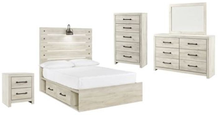Includes panel storage bed (headboard, footboard, side storage, rails and slats), nightstand, 5-drawer chest and 6-drawer dresser with mirror