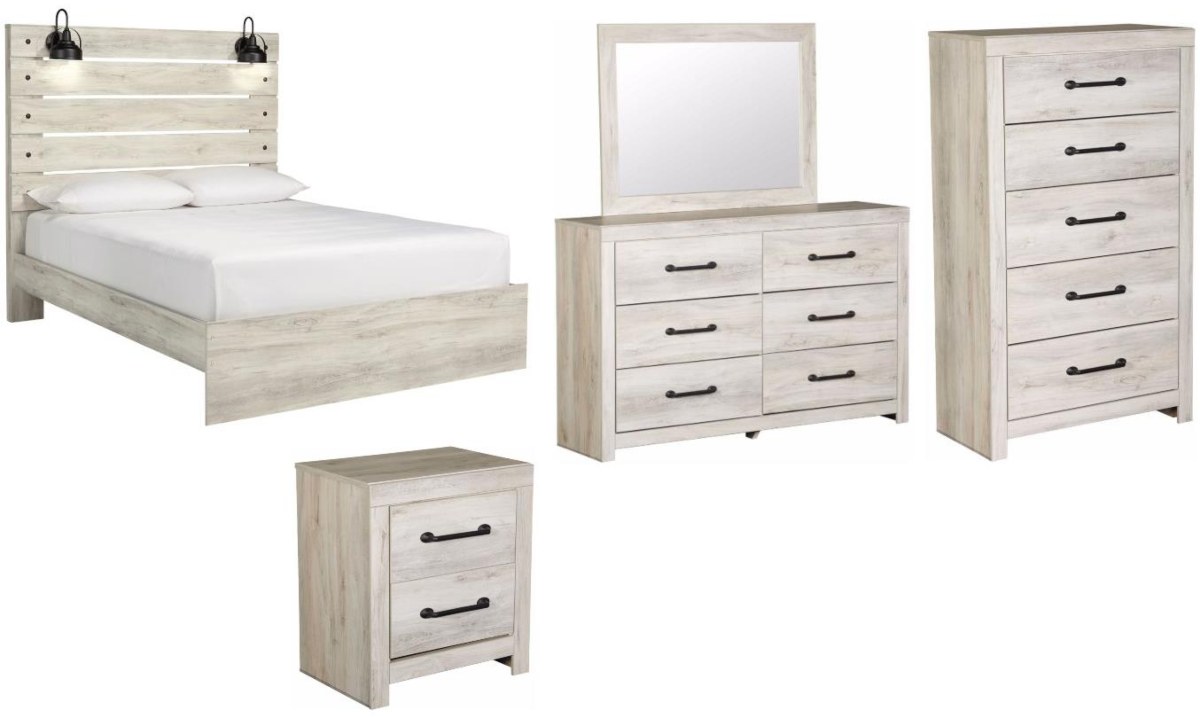 Includes panel bed (headboard, footboard and rails), 6-drawer dresser with mirror, 5-drawer chest and 2-drawer nightstand