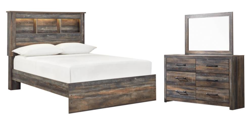 This full-size bookcase bed, dresser and mirror is a refined take on barn board beauty. Its complex, replicated wood grain showcases hints of burnt orange and teal tones for a sense of weatherworn authenticity. Three open cubbies lined with a dimming LED light strip keep bedtime reads top of mind. The dresser with six smooth-gliding drawers lined with faux linen laminate and industrial dark-tone hardware complete this rustic and industrial style bedroom. Mattress and foundation/box spring available, sold separately.Read More