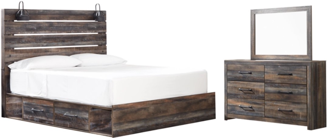 Includes king-size panel bed (headboard, footboard, under bed side storage and wood roll slats) and 6-drawer dresser with mirror