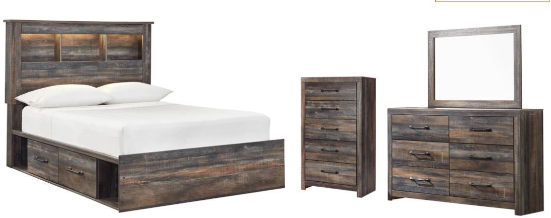 This full-size bookcase bed with storage, dresser, mirror and chest of drawers is a refined take on barn board beauty. Its complex, replicated wood grain showcases hints of burnt orange and teal tones for a sense of weatherworn authenticity. Three open cubbies lined with a dimming LED light strip keep bedtime reads top of mind while underneath the bed a pair of smooth-gliding drawers and two open cubbies accommodate casually cool storage bins. The dresser and chest with smooth-gliding drawers lined with faux linen laminate and industrial dark-tone hardware complete this rustic and industrial style bedroom. Mattress and foundation/box spring available, sold separately.Read More