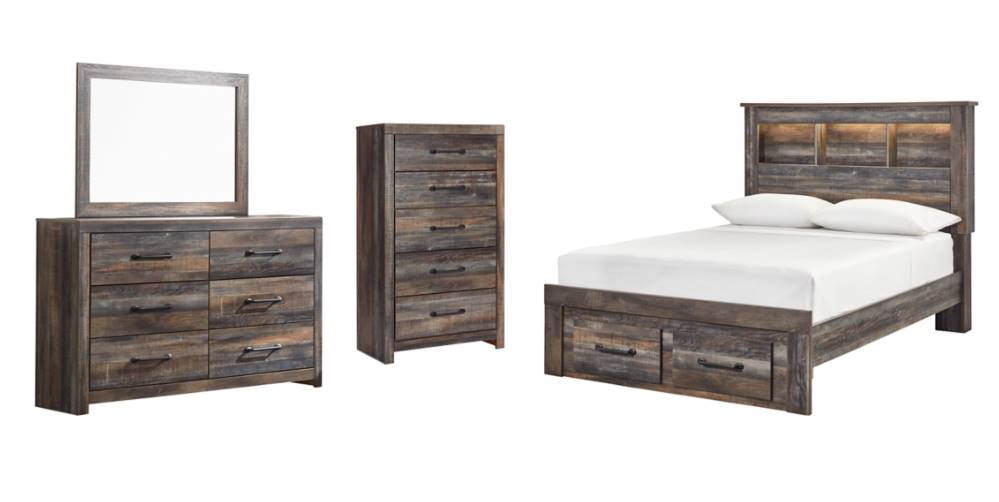 Includes bed (with bookcase headboard, 1-drawer storage footboard and rails), 6-drawer dresser with mirror and 5-drawer chest