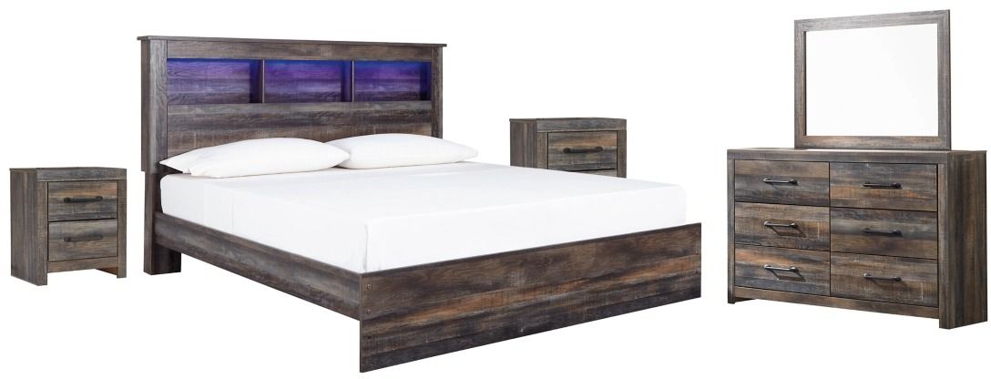 Includes king-size panel bookcase bed (bookcase headboard, footboard and rails), 6-drawer dresser with mirror and two 2-drawer nightstands