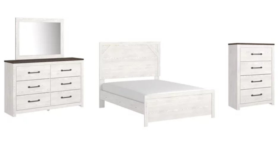 Includes full panel bed (headboard, footboard and rails), 6-drawer dresser with mirror and 4-drawer chest