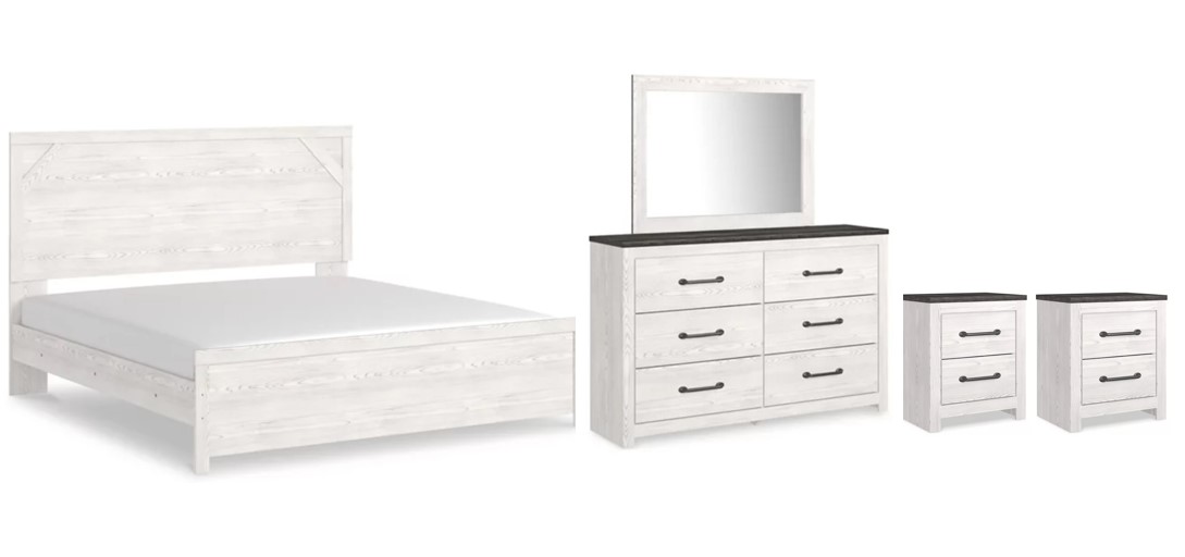 Includes king panel bed (headboard, footboard and rails), 6-drawer dresser with mirror, and two 2-drawer nightstands
