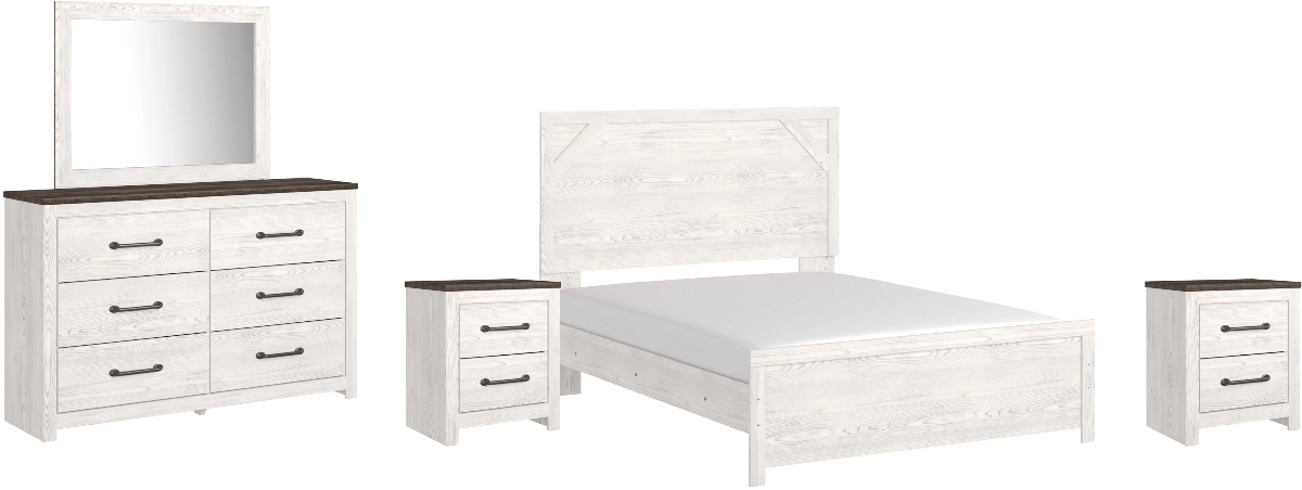 Includes queen panel bed (headboard, footboard and rails), 6-drawer dresser with mirror, and two 2-drawer nightstands
