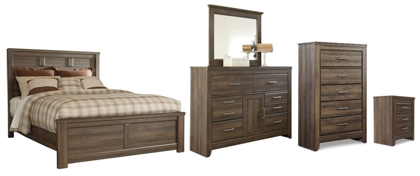 Includes panel bed (headboard, footboard and rails), 6-drawer dresser with mirror, 5-drawer chest and 2-drawer nightstand