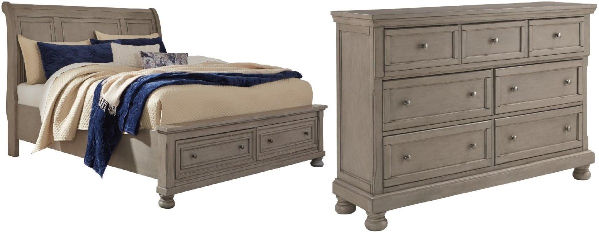 Includes california king sleigh headboard, footboard with storage, rails and dresser
