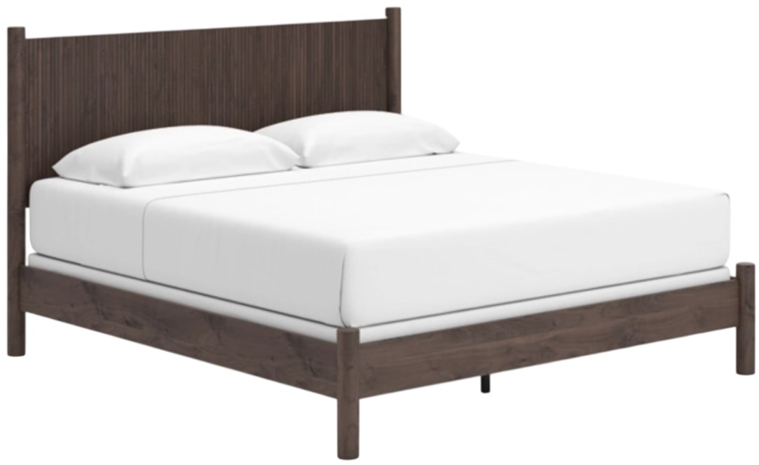 Crafted with both form and function in mind, this Pamytta king panel bed brings a dash of retro-cool character to your modern boho aesthetic. Its reeded headboard adds an on-trend touch to the classic silhouette. Warmly welcoming with a rich brown finish, the bed pairs well with muted hues.Read More
