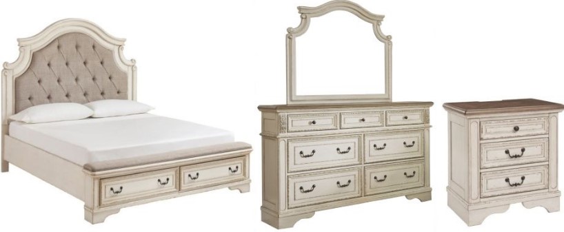 Elevating the art of traditional cottage styling, this bedroom package is your dream bedroom retreat realized. A curvaceous beauty, the brilliant upholstered bed wows with dramatic scalloped details and fanciful trim work and charms with a distressed chipped white finish for heirloom appeal.Read More