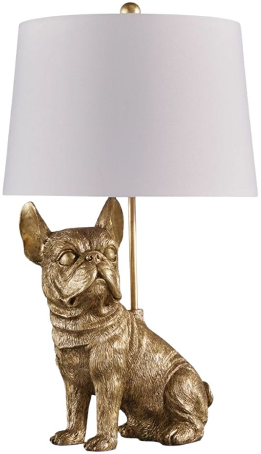 This charming table lamp brings a touch of playful sophistication to your home. An adorable French bulldog base, finished in a sleek goldtone, is sure to be a conversation starter. This lamp's warm and inviting ambiance makes it a delightful addition to your bedside table or living space decor.Read More