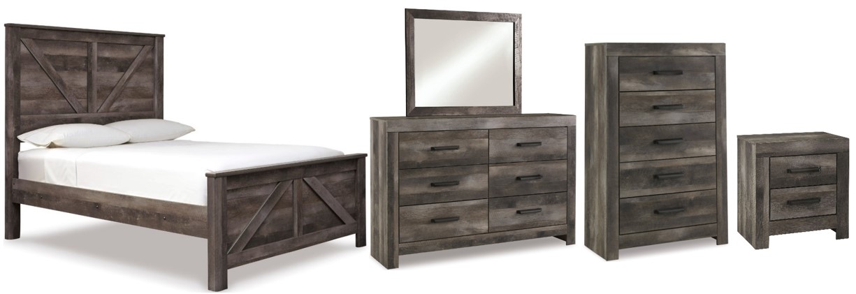Includes king crossbuck panel bed, mirrored dresser, chest and nightstand